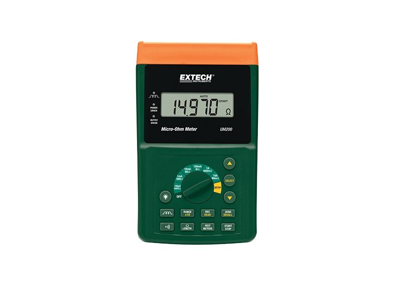 Extech Instruments Micro Ohm Meter With Nist UM200-NIST. The UM200 has 6 ranges with 3 sub-ranges in each current range. Measurement of resistive and inductive materials. 5-Digit backlit LCD PC interface. Auto or Manual ranging 10A maximum test...