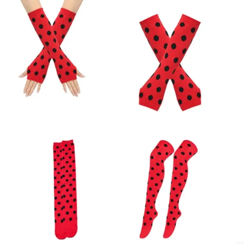 F2TD Adult Kids Insect Dots Patterned Fingerless Gloves and Over Knee Socks Set for Halloween Christmas Party Accessories