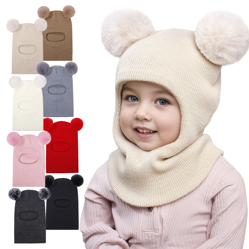 Unisex Baby Warm Knitted Pullover Hat with Pompoms Thermal Ear Flaps Cute Winter Cap for Boys And Girls Children Hood Accessory