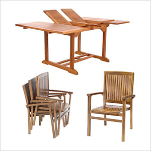 Stylish and solid, our 5-Piece Butterfly Extension Table Stacking Chair Set is hand crafted from Indonesian Teak, with a java colored finish, and fitted with solid brass hardware.