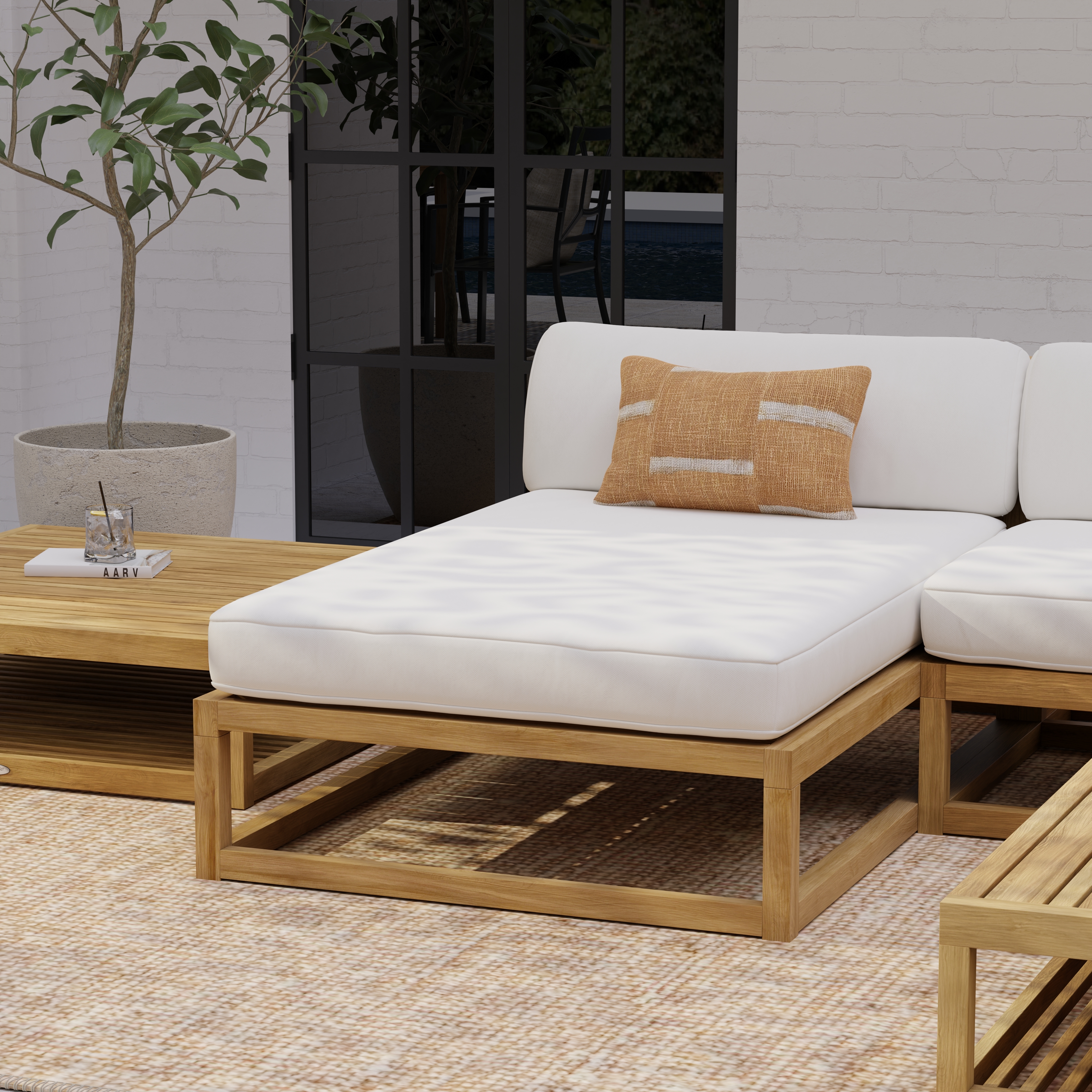 "The Maya Teak Chaise Daybed can be used alone as a lounger or can be combined with other pieces from the Maya Collection. Plush cushions sit atop a minimal but extremely sturdy teak frame. Cushions made with Quick Dry Foam core and solution dyed...  Read more