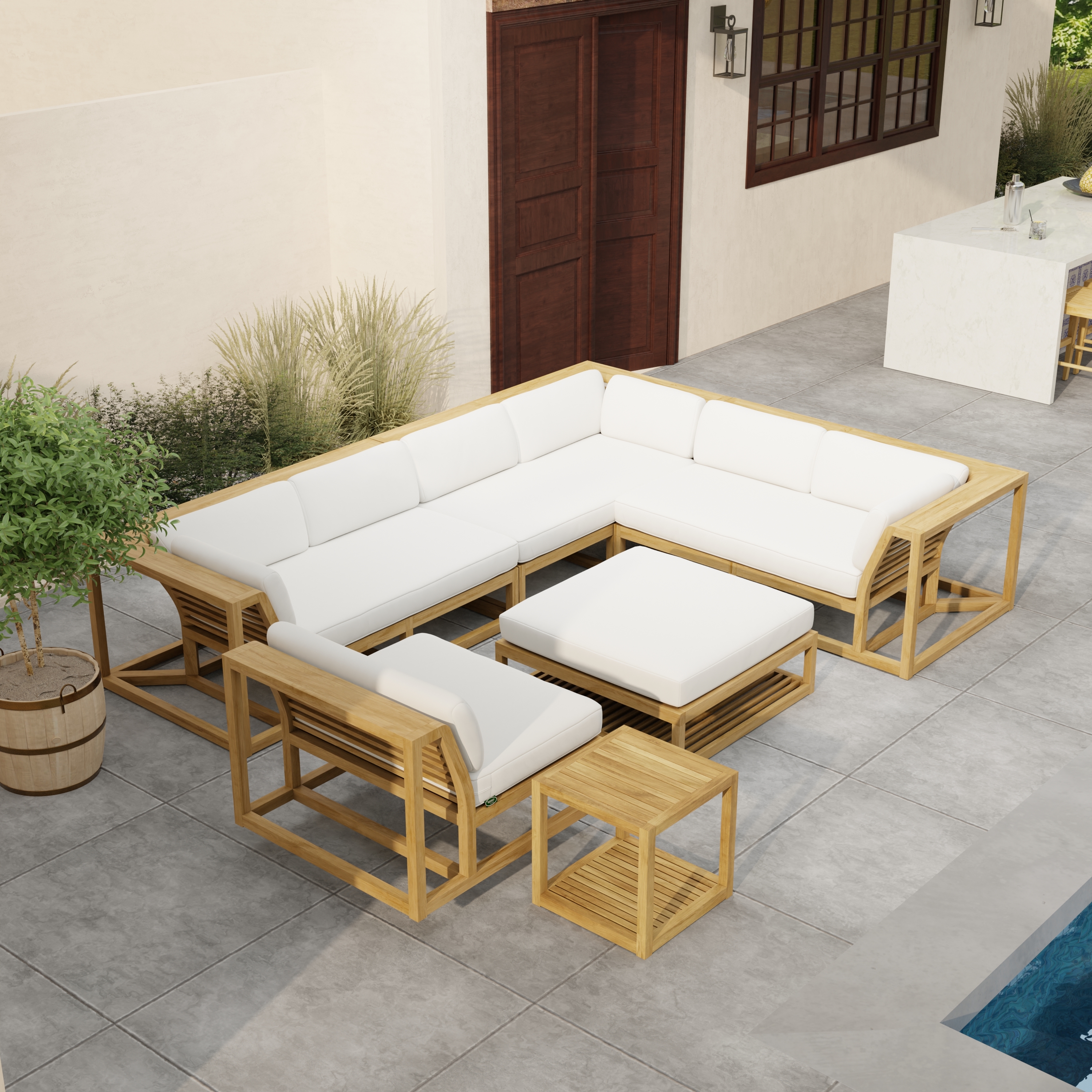 "Maya 8 piece Teak Outdoor Sectional Conversation Set. Modular Design. Upscale Sophistication. Made with Grade A Teak. Cushions made with Quick Dry Foam core and solution dyed Sunbrella fabric. Rated Best Overall by Wall Street Journal."  Read more