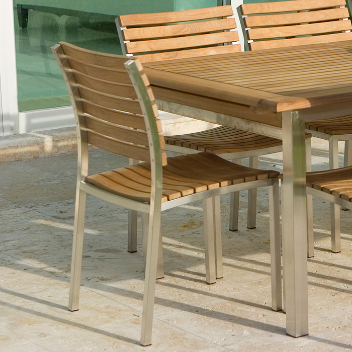 "The Vogue Side Chair combines teak wood and stainless steel into a sleek contemporary design. Stacks up to four high for convenient storage. Built with Grade A Teak harvested from sustainable plantations in Indonesia and premium stainless steel."  Read more