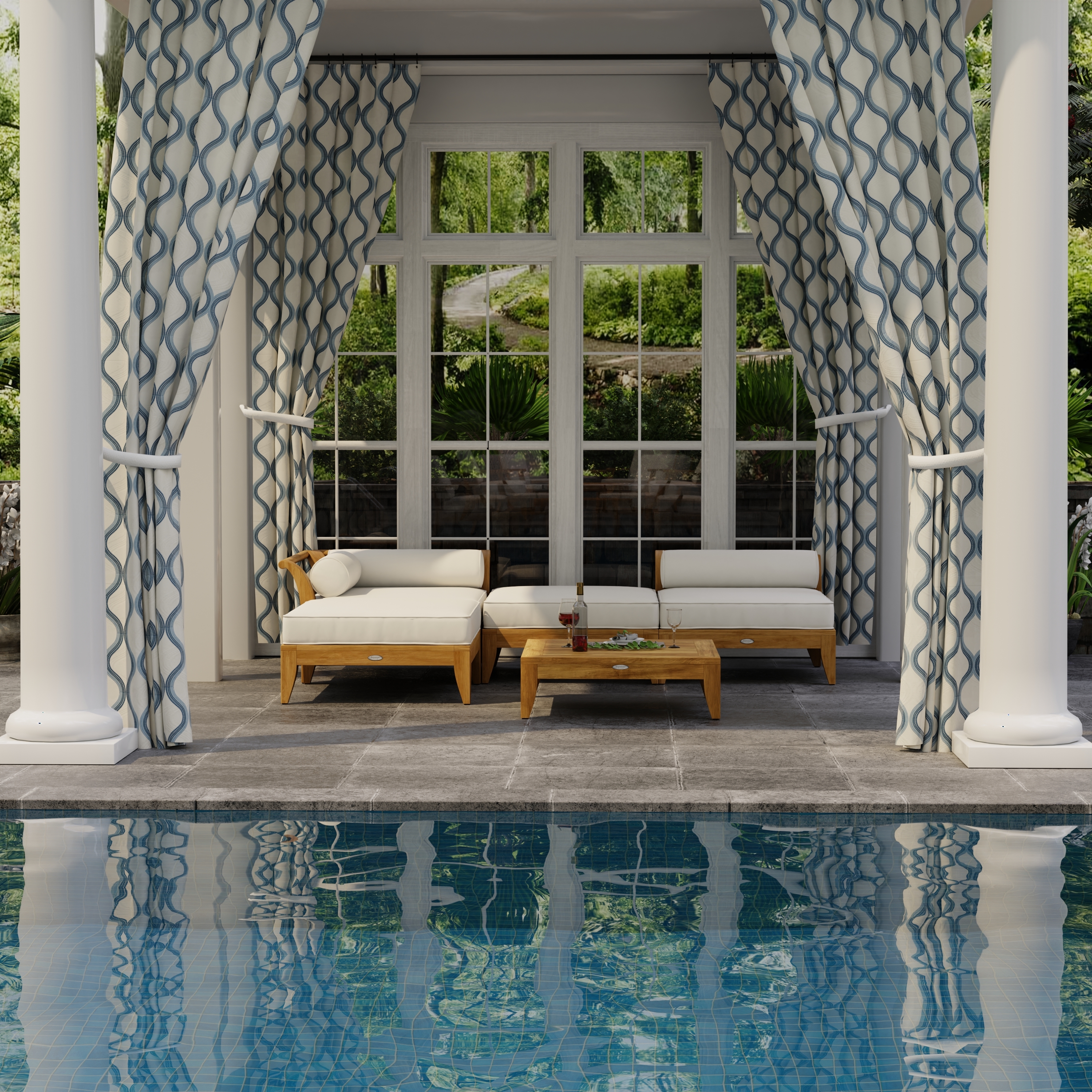 "Aman Dais 4 piece Teak Deep Seating Day Bed. Consists of two end sectionals and two fill sectionals. Made of Grade A Teak harvested from renewable plantations in Indonesia. Cushions made of Quick Dry Foam core and solution dyed Sunbrella fabric."  Read more