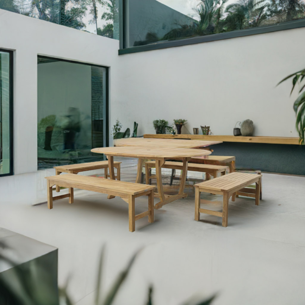 "The Martinique Backless Bench Set comes complete with one Martinique Oval Teak Extension Table, two 4 Foot Teak Backless Benches, and 2 5FT Backless Teak Benches to complete this lovely wooden outdoor furniture set."  Read more