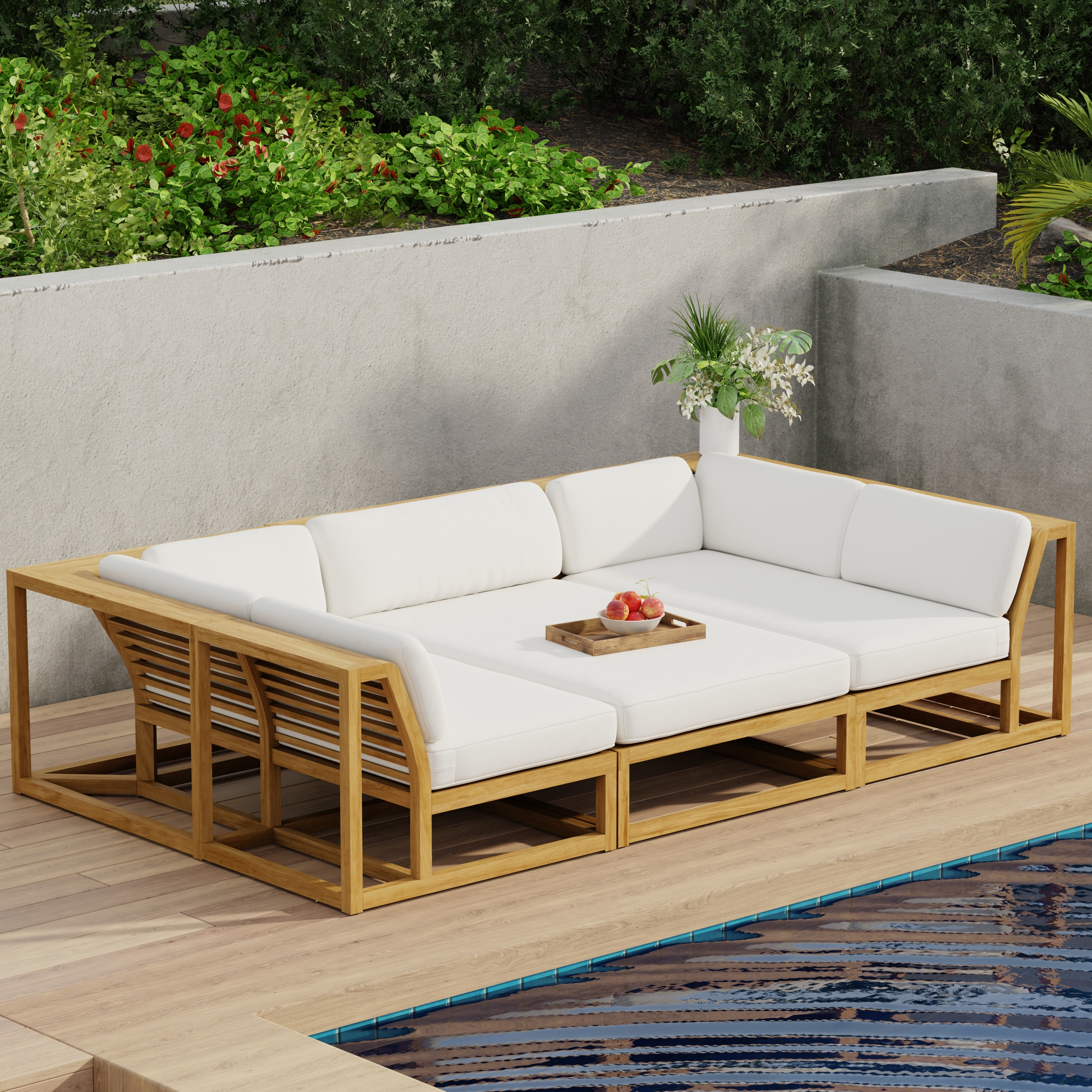 "The Aman Dais Teak Day Bed 'L' Set consists of one corner sectional and one end sectional and two ottoman/fill sectional. Made of 100% certified Teak Wood. Our Teak Day Bed is built to last a lifetime and backed with our Lifetime Warranty."  Read more