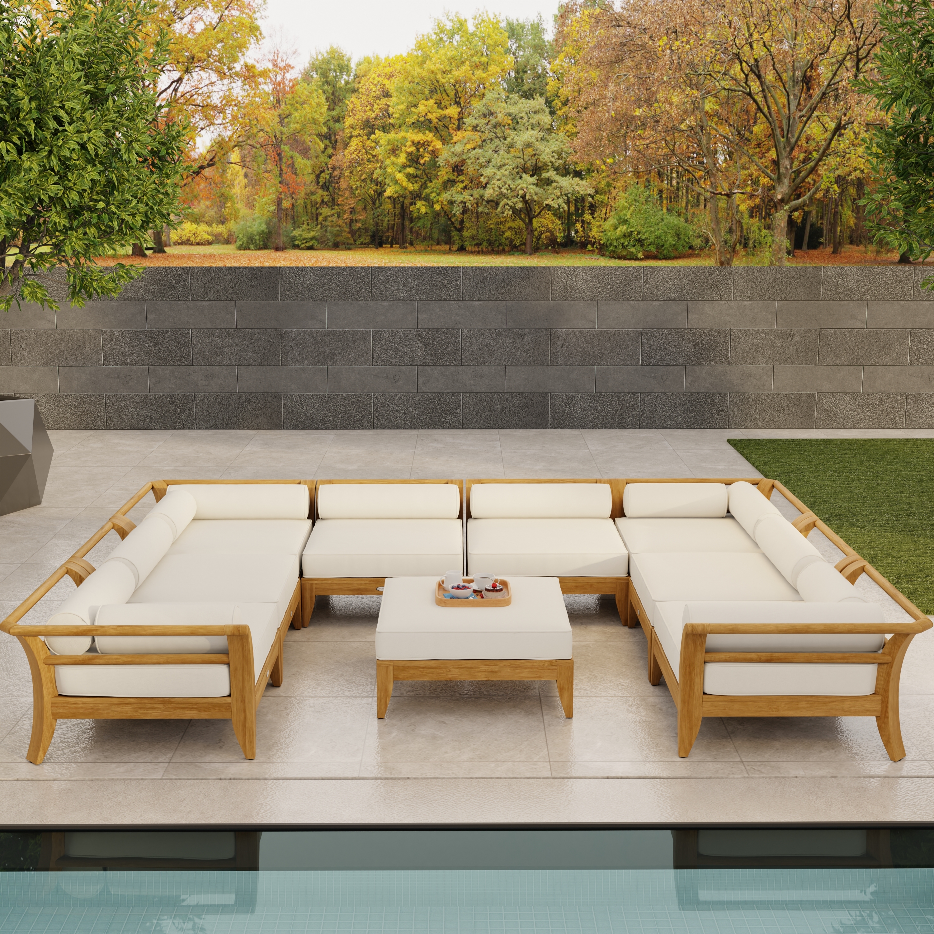 "The Aman Dais Teak 9 piece Daybed Sofa Set consists of the 3 distinct modular sectionals from the Aman Dais Collection. Made of 100% certified teak wood. Built to last a lifetime and backed with our Lifetime Warranty."  Read more