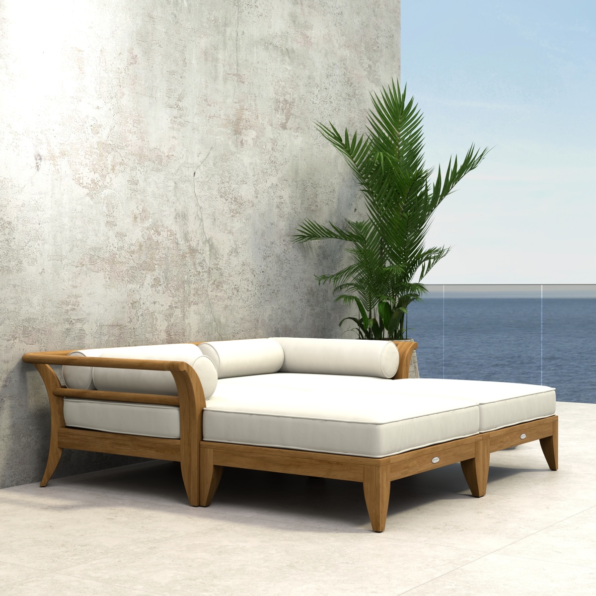 "3 piece Maya Teak Sectional Daybed. Plush cushions atop a clean-lined teak frame give the visual impression of lightness while its 6 inch wrap-around armrests provide ample space for drinks and are sturdy enough to sit on. Crafted with SVLK...  Read more