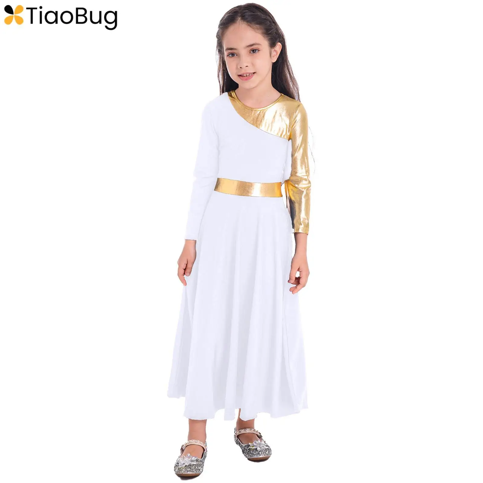 Kids Girls Metallic Ballet Lyrical Praise Dance Long Dress Liturgical Worship Color Block Church Dresses Dancewear