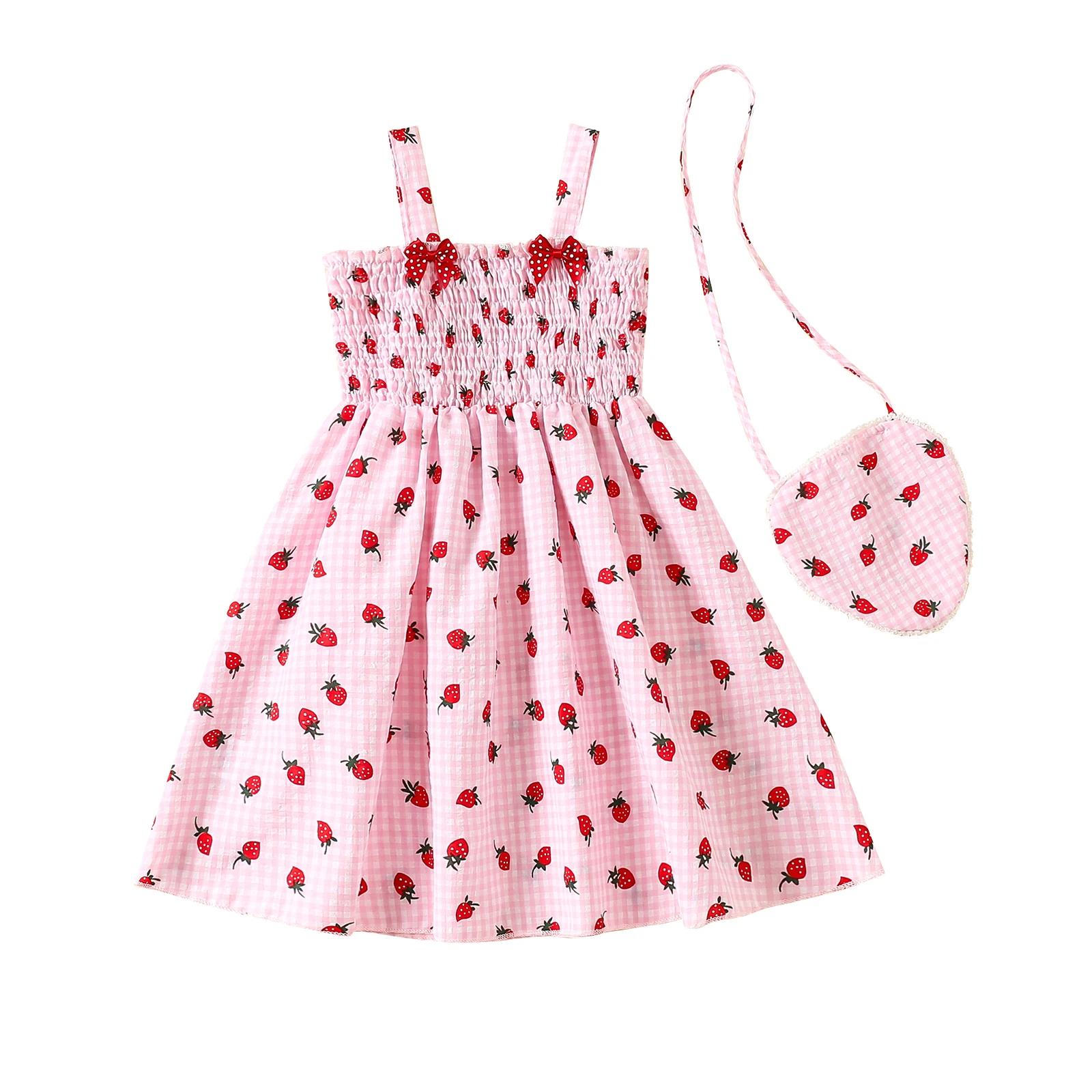2-7Y Kids Girls Dress Plaid Strawberry Print Sleeveless Casual Dress Toddler Fashion Princess Summer Dress with Bag