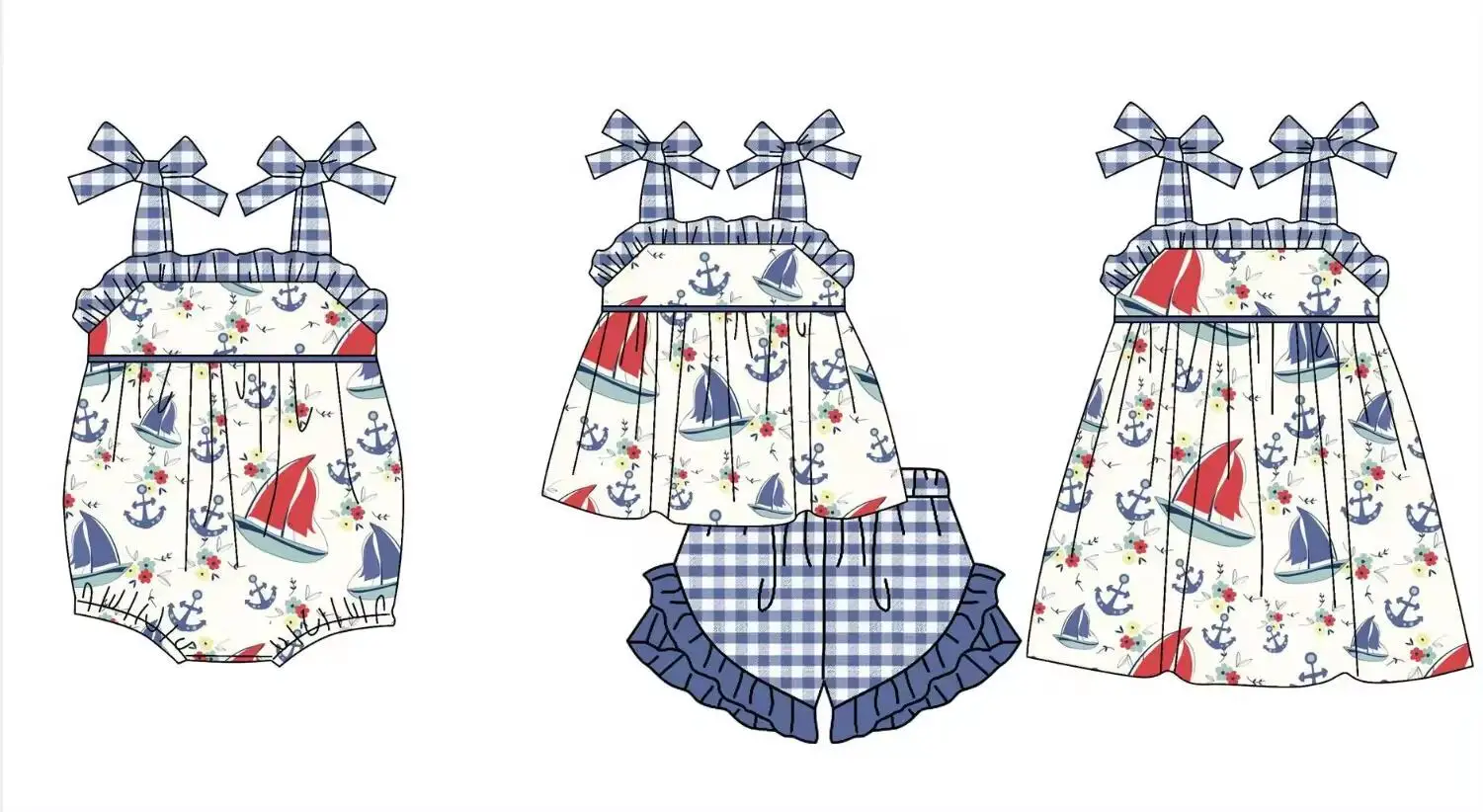 New boutique children's set suspender bow sailboat print shorts lace girl set baby jumpsuit dress
