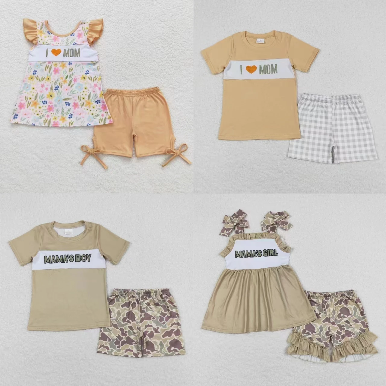 Wholesale Children Wear Embroidery Mama Set Kids Short Sleeves Shirt Camo Shorts Baby Boy Girl Toddler Floral Mom Outfit
