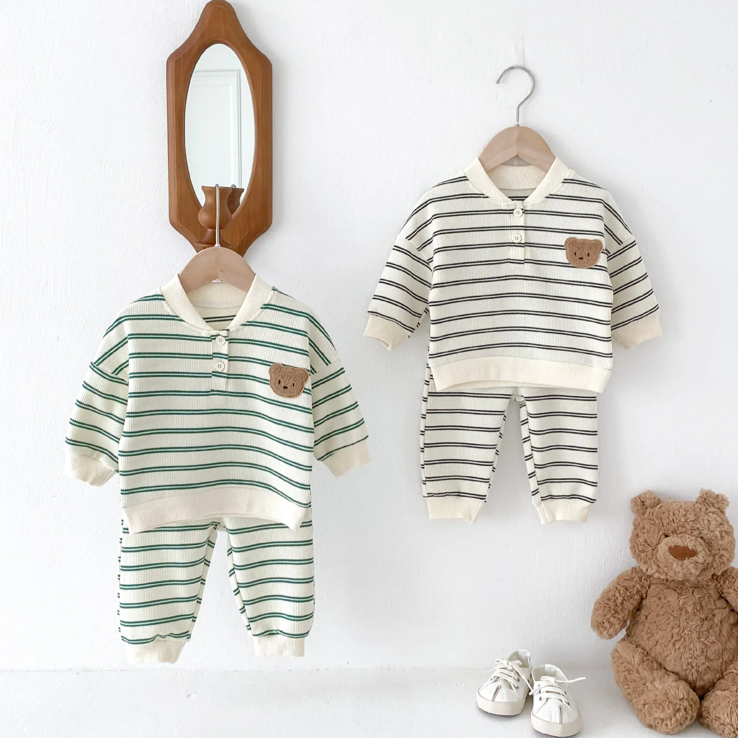 2024 Autumn Set Infant Toddler Striped Cartoon Long Sleeve Sweatshirt Boys Girls Baby Pullover Casual Top + Pants