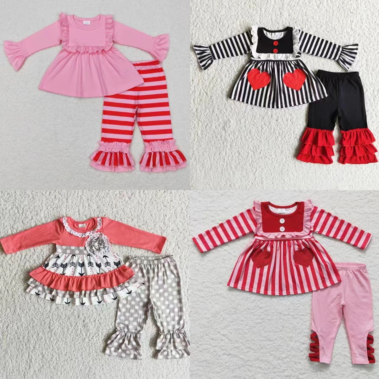 Wholesale Children Valentine's Day Set Long Sleeves Hearts Tunic Tops Kids Baby Girl Ruffle Pants Children Stripes Outfit