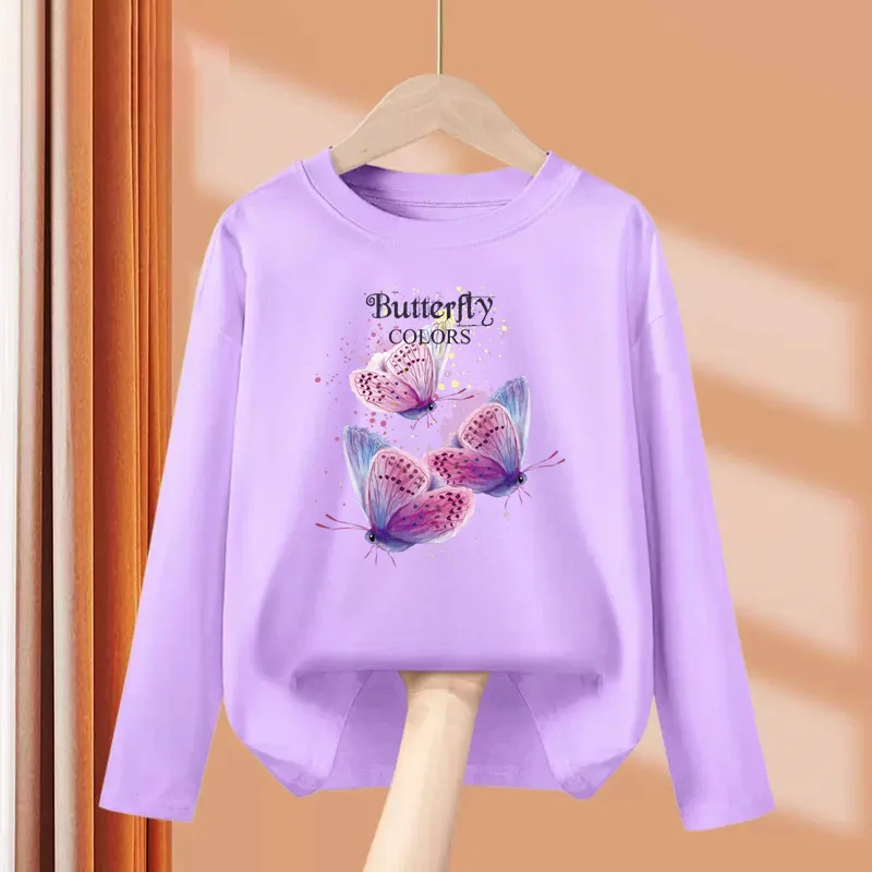 New Girls Autumn Clothes Butterfly Graphic T-shirt 3-14 Age Kid Long sleeved Cotton Tops Fashion Brand Tees