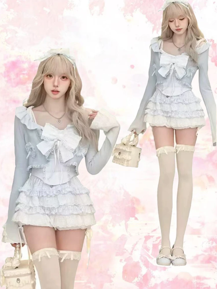 Japanese Elegant Sweet Soft Women Long Sleeve Ruffled Patchwork Cardigan Jacket+bow Strap+ Cake Skirt Party 2025 Fashion New  Read more