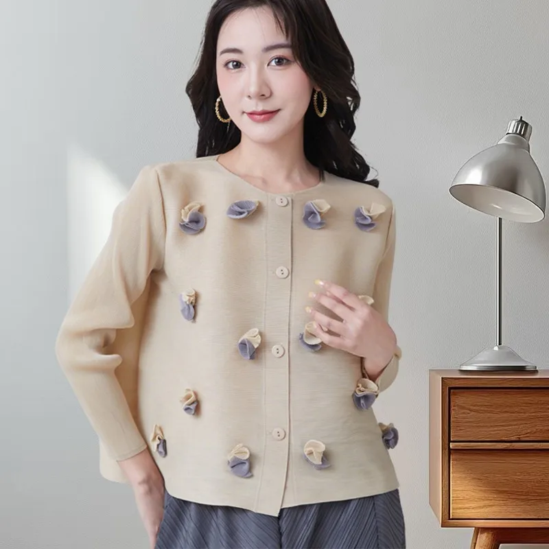 2025 Summer New Miyake Tops Flower Peplum Slim Thin Section Pleated Cardigan Round Neck Long Sleeve Large Size Commuter Clothing  Read more