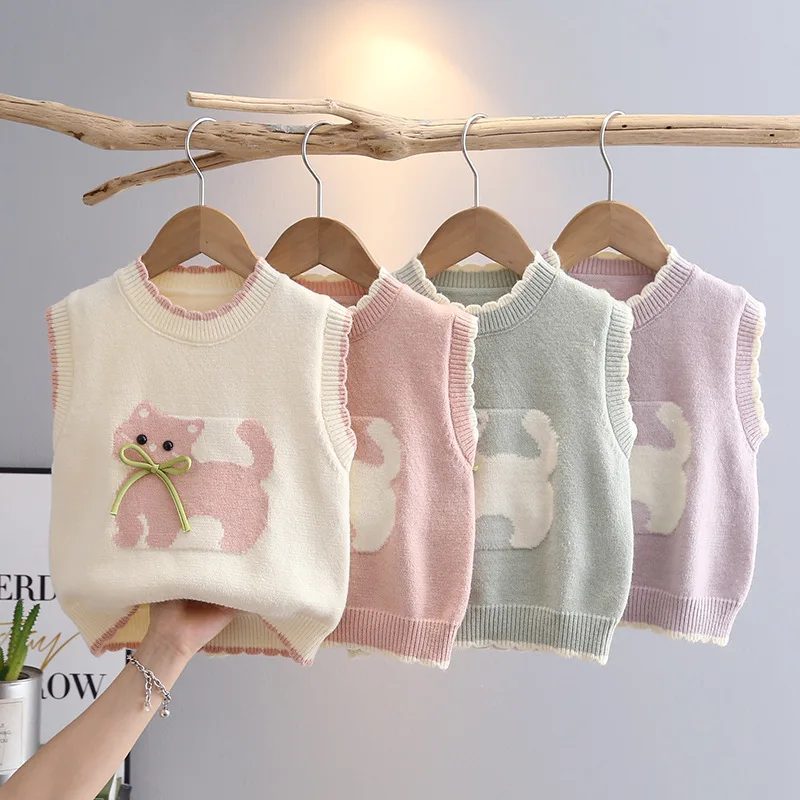 Fashion Fall Winter Knitted Sweaters Girls Casual O-Neck Pullover Vest All-match Sleeveless Girl Cat Pattern Tops Jumper IY06051
