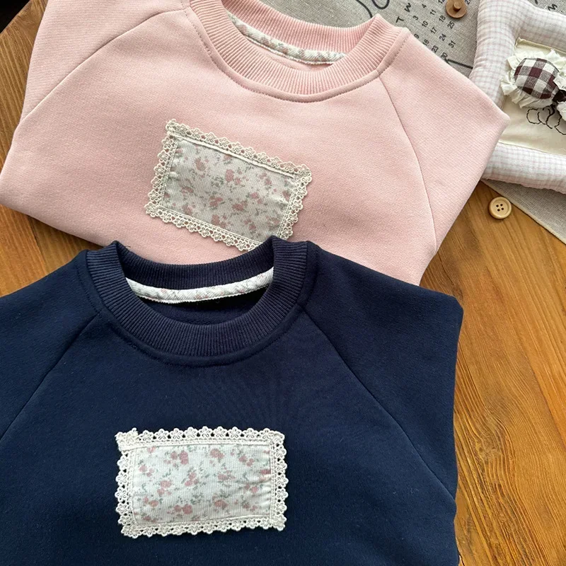Sweater Autumn New Korean Fashionable Fleece Countryside All-match Floral Lace Patch Hoodie Kids Clothes