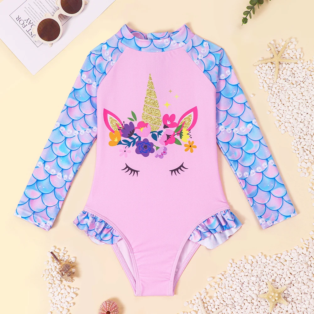 Toddler Girl Long Sleeve Ruffle Swimsuit One Piece Zipper Swimwear Kids Hawaiian Bathing Suit Unicorn Swim Shirts for Surfing