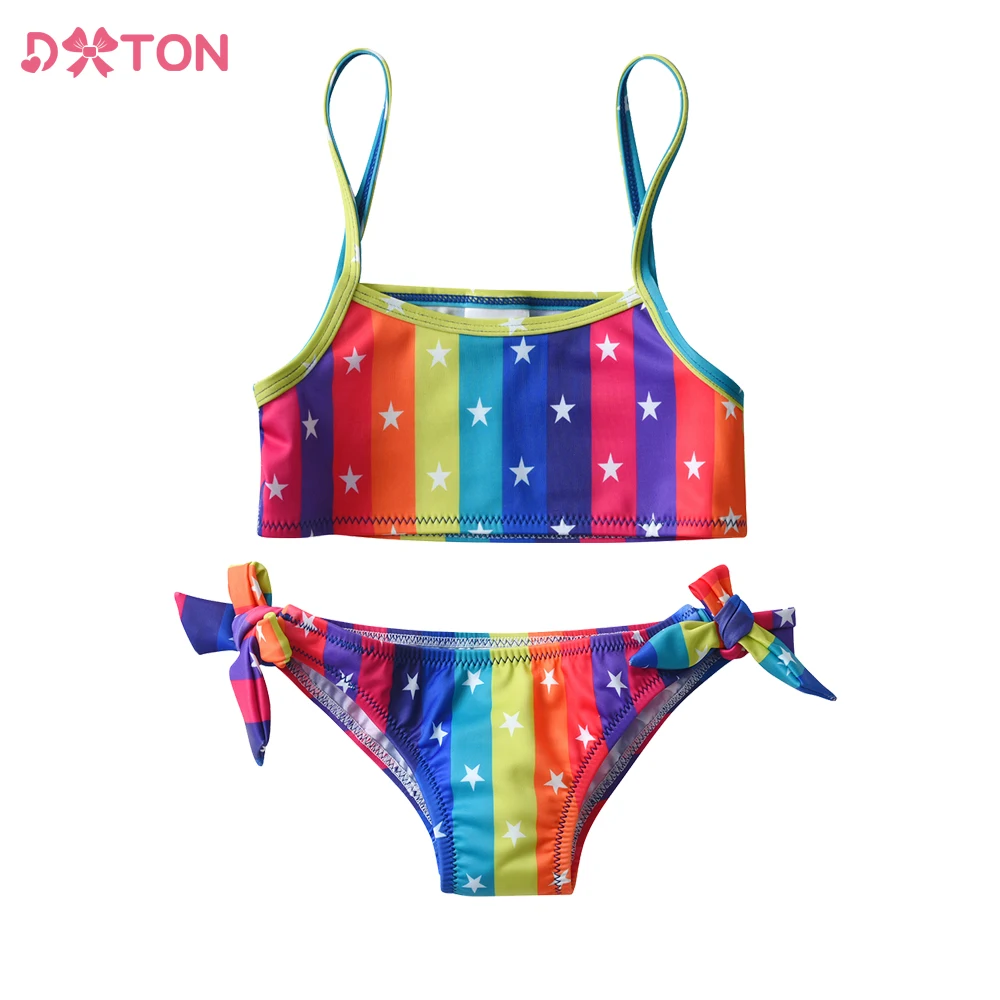 DXTON Girls Summer Vacation Beachwear 2PCS Elastic Children Cool Swimwear Rainbow Kids Swimming Suit Quick Drying Girls Clothing