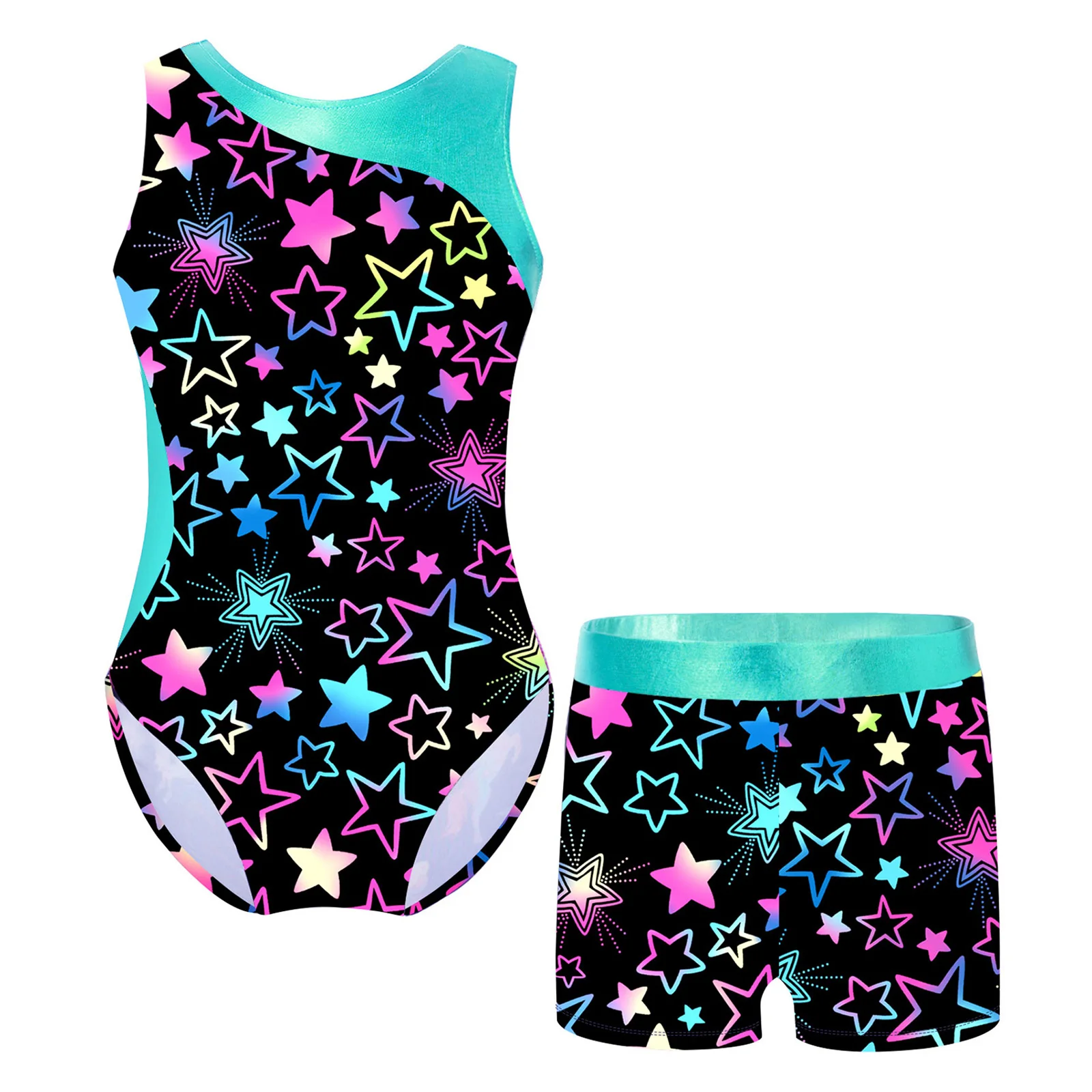 Children Girls Printed Gymnastics Leotard Ballet Dance Outfit 2 Pieces Swimwear Swimsuit Jumpsuit with Shorts Skating Bodysuit