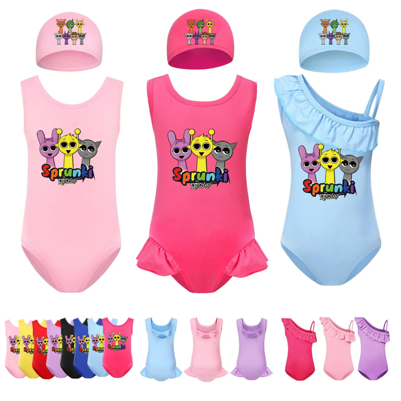 Cute Sprunki Cartoon Swimwear Kids Game Incredibox BeachWear with Cap 2pcs Set Sleeveless Swimming Toddler Girls Catnap Swimsuit