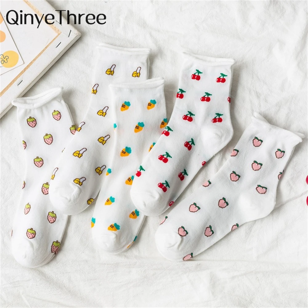 Funny Cute Girls' Cartoon Carrot Peach Strawberry Banana Cherry White Art Socks Pregnant Rolled Curled Loose Mouth Dropship