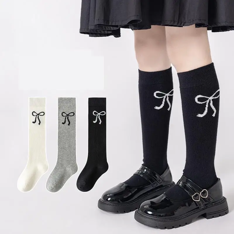 3pairs Girls' Knee-high Slouch Socks Black White Gray Bow Spring Stackable Tights For Kids 3-12Y Children Casual School Sockens