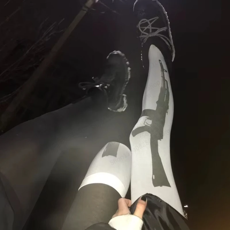 White Gothic retro gun print long socks Harajuku slim fit knee high socks Y2K style cosplay cute socks Kawaii 2000s Emo girl