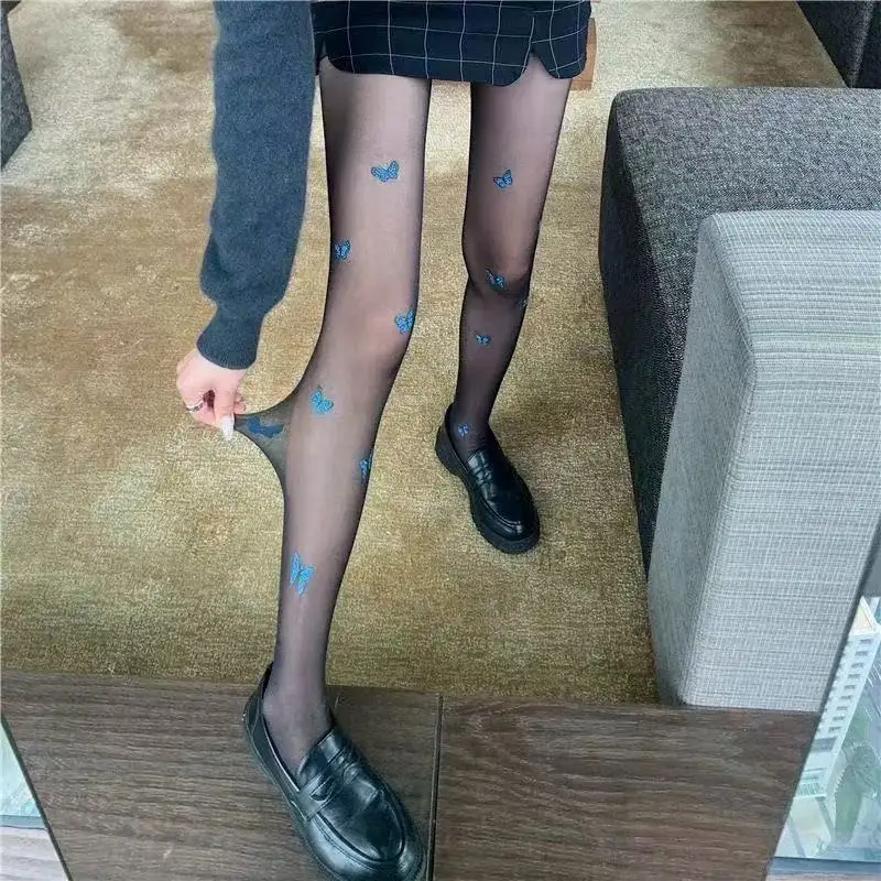 1 pair of printed blue butterfly black stockings with anti snagging and non shedding black silk butterfly print pattern and skin