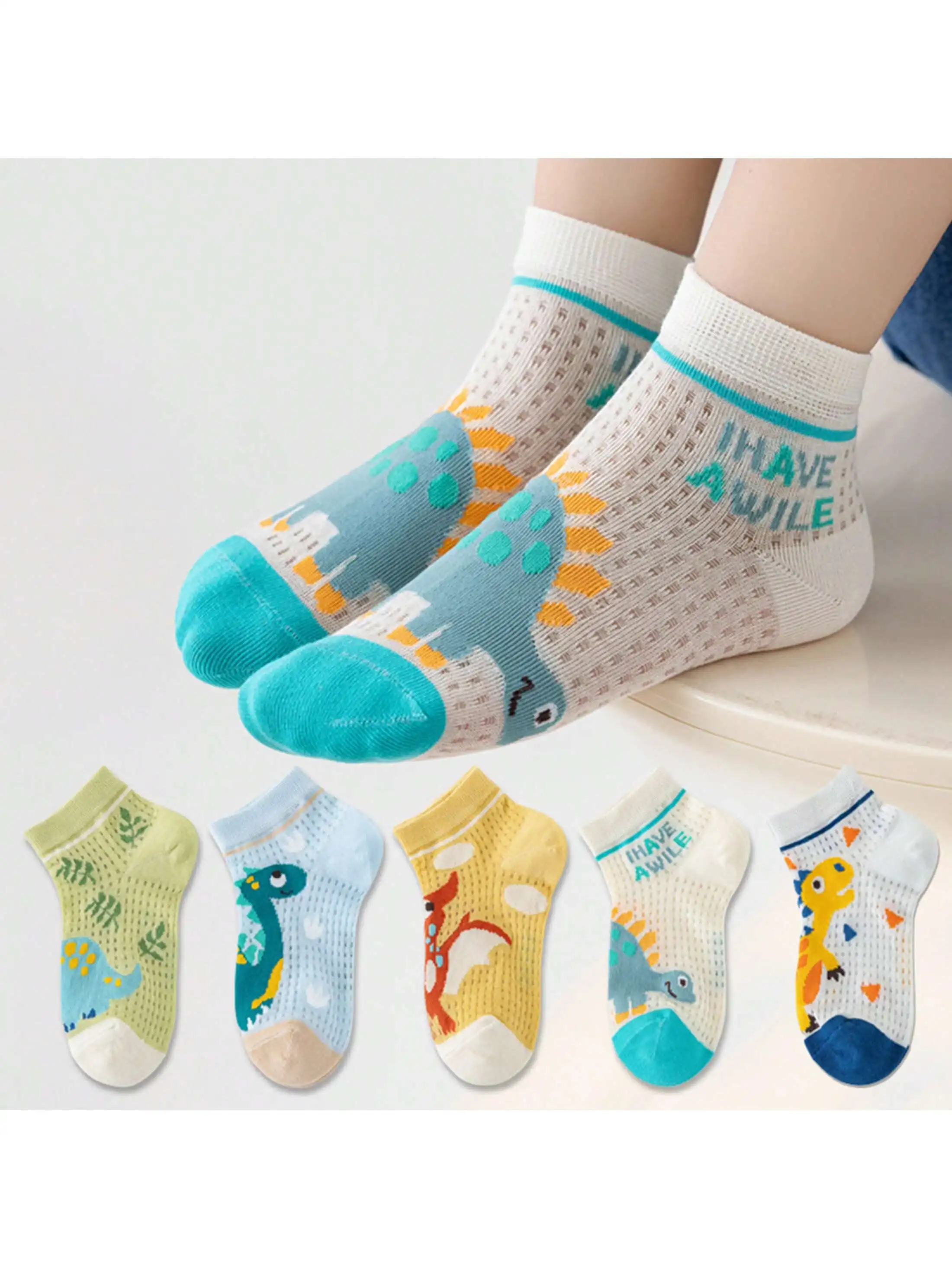 5 Pairs of Four-Season Boys' Socks, Summer Mesh Thin Mid-Calf Socks, Cartoon Mesh Green Dinosaur Spring and Summer Boys' Summer Kidsren's Socks