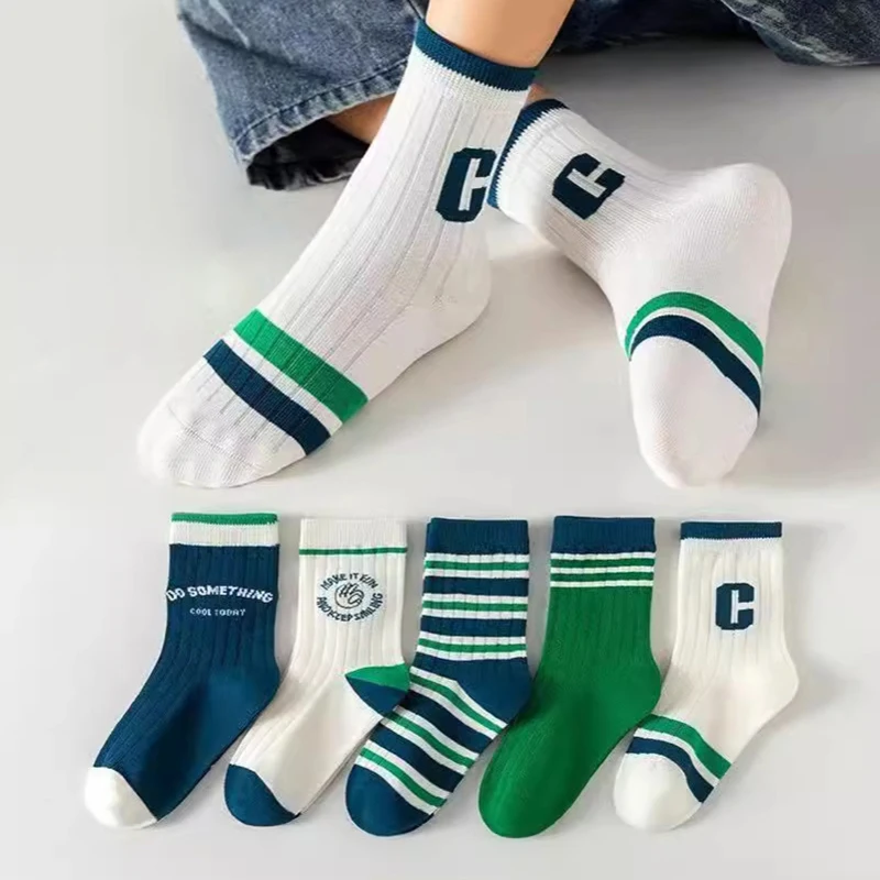 5Pairs Fashion Stripe Children Sports Socks Green Letter C Kids Middle Tube Sock 3-13Year Boys Girls Spring Autumn Cotton Socks