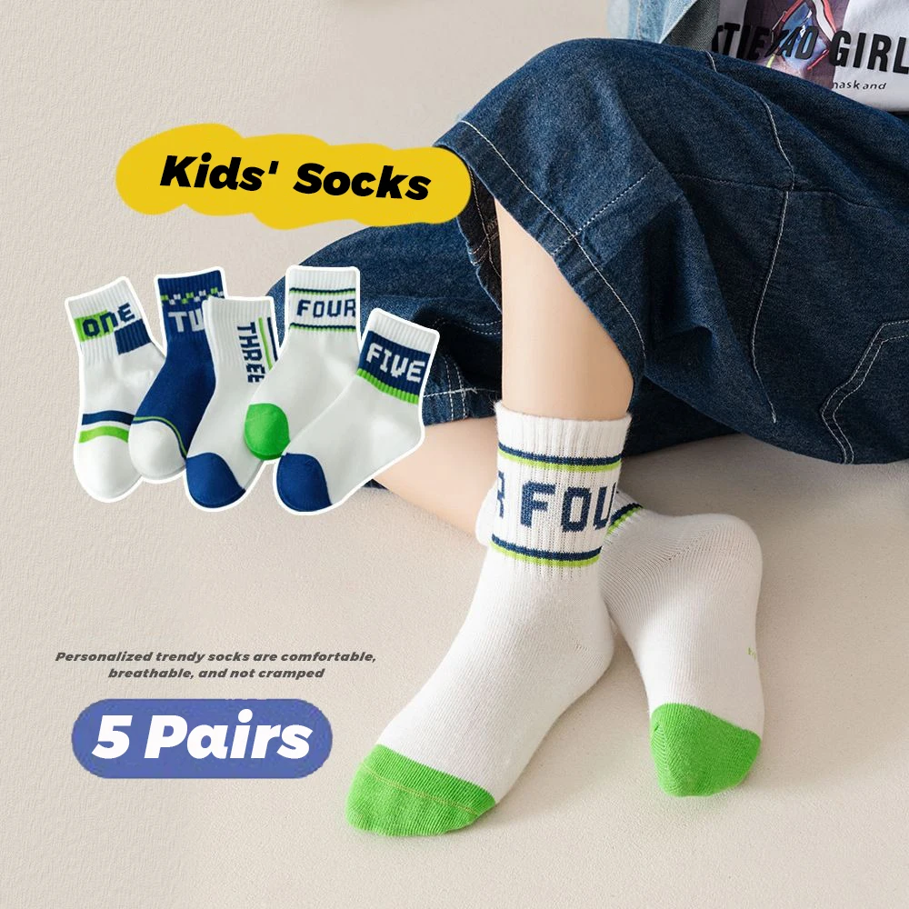 5 Pairs Children's Socks Autumn/Winter New Boys' Trendy Alphabet Mid Tube Socks Boys' Sports Student Socks