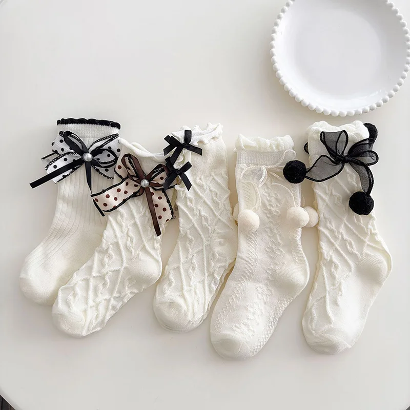Lolita Girl White Socks Mesh Bow Calf Sock Children Lace Mid Tube Socks Spring Summer Kids Bow Stockings fit Foot Length 13-15cm