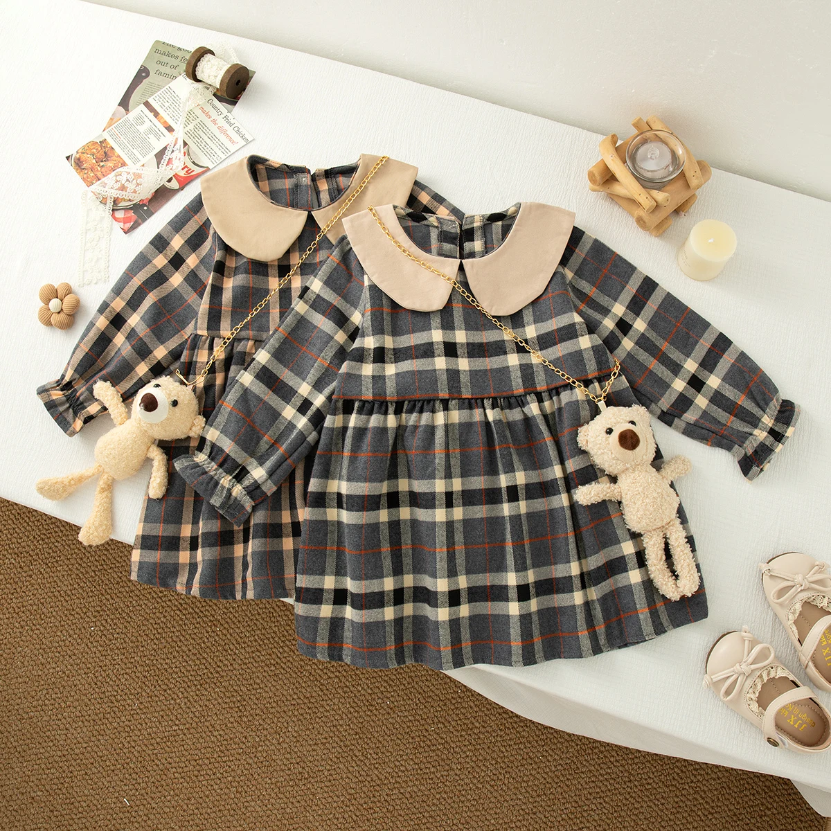 Baby Girl Dress Spring And Autumn Cotton Plaid Long Sleeved Girl Dress Cute Lapel Girl Princess Dress Baby Clothing