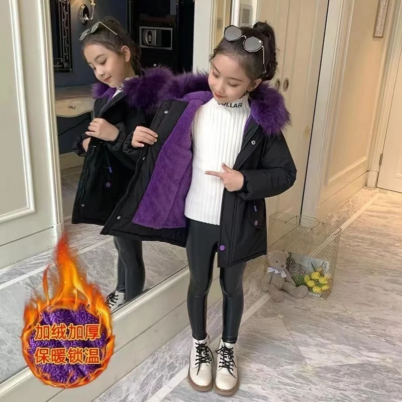 -30℃ Winter Padded Thick Jacket Girl Fur Collar Hooded Warm Parka Big Children 4-14Y Kids Teenage Long Cotton Outerwear Snowsuit