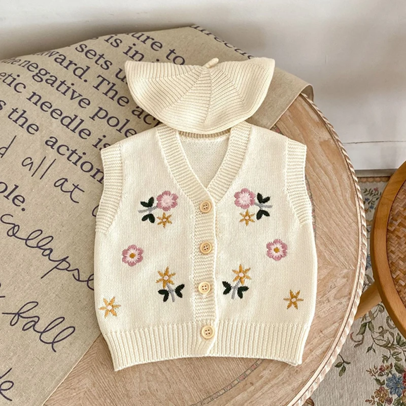New baby clothing for spring and autumn seasons, 0-3 year old girls, flower embroidered knitted pure cotton vest
