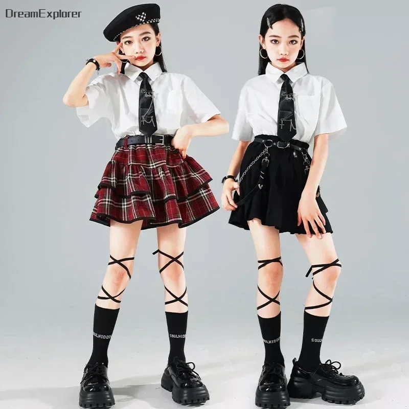 Hip Hop Girls Shirt Street Dance K-pop Plaid Tiered Skirts Kids School Uniforms Streetwear Children Jazz Costumes Clothes Sets