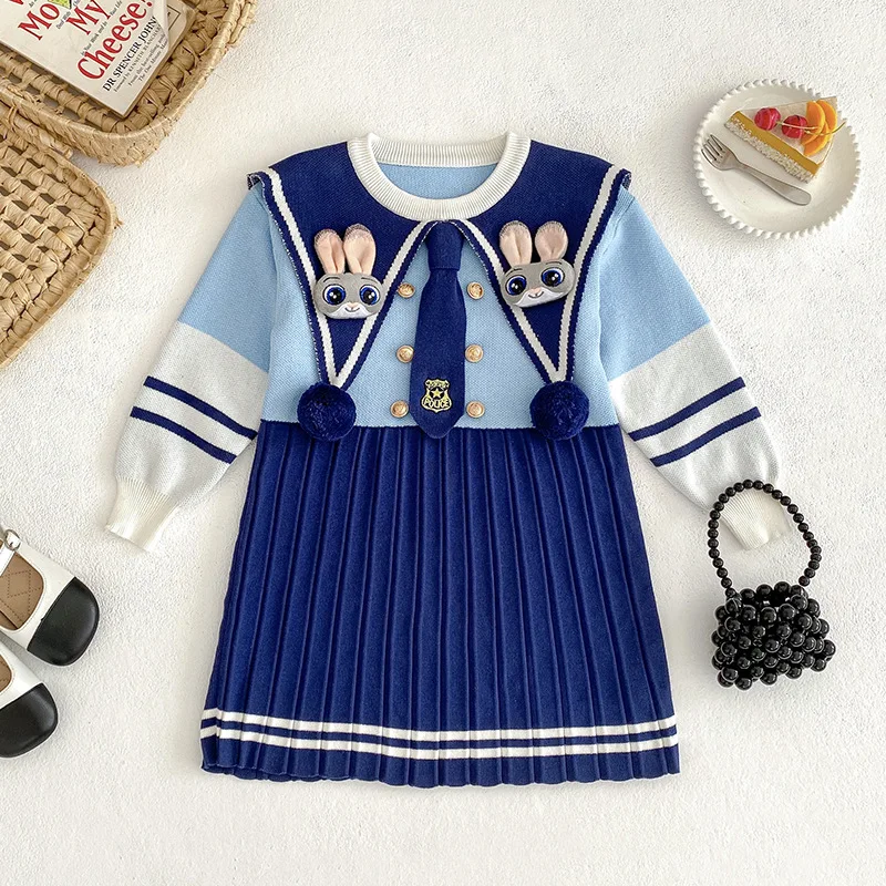 Disney Judy Hopps Officer Rabbit Knitted Dress For Girls Spring Autumn College Style Cartoon Splicing Pleated Sweater Dresses  Read more