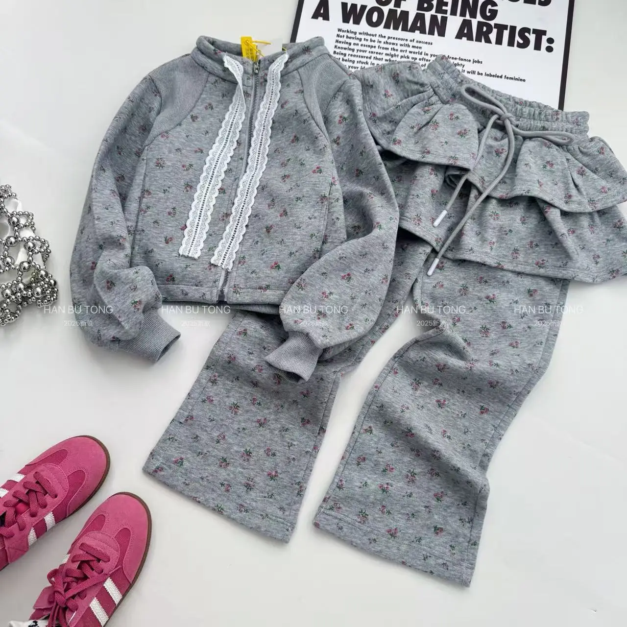 Girls Set 2025 New Children Spring and Autumn Bow Lace Beautiful Korean Layered Floral Sports Two Piece Set