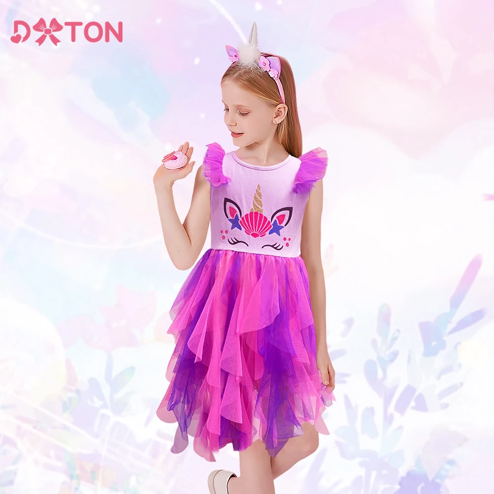 DXTON Sleeveless Children Dresses Summer Vacation Kids Girls Dress Gradient Tulle Patchwork Unicorn Toddler Cute Cartoon Clothes