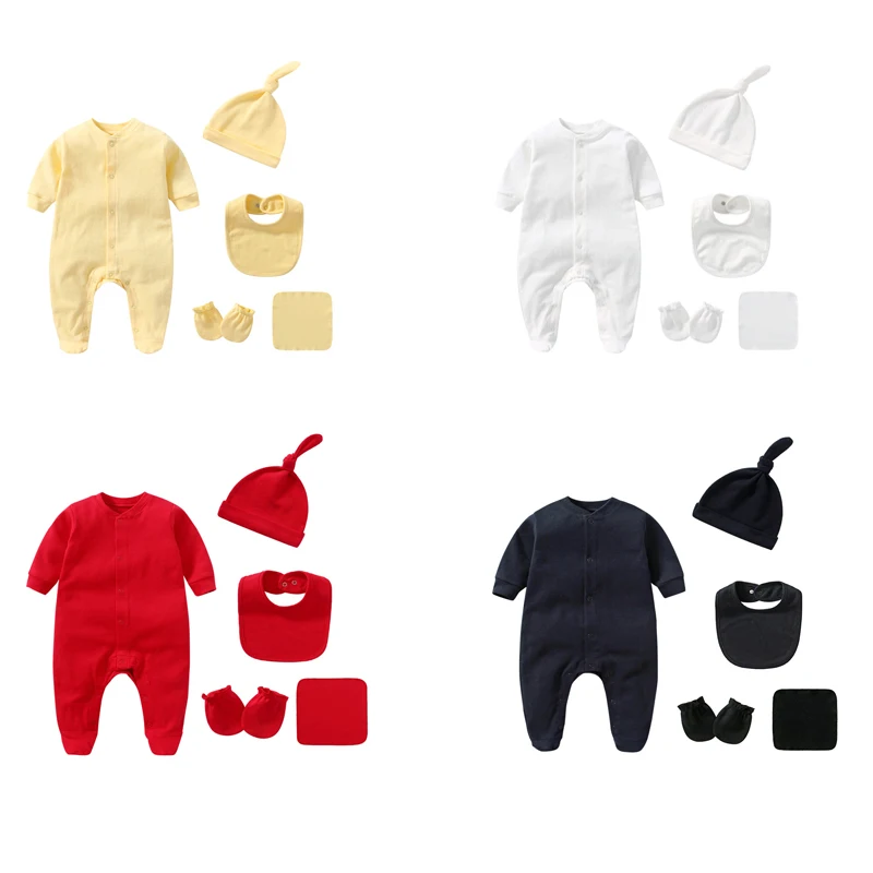Baby Set Newborn Baby Boy Girl Clothing 100% Cotton Long Sleeved Solid Color Rompers Hat Bib Suit 0-3 Months Infant Products
