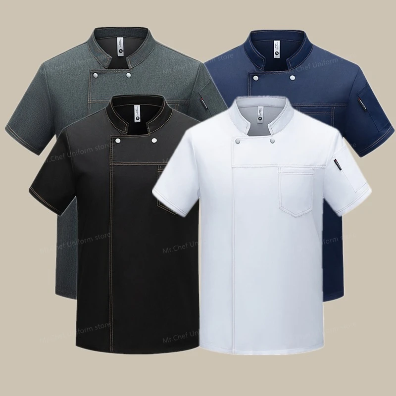 White Men Chef Jacket restaurant Bakery Food Service Short Sleeve Breathable Double Breasted chef uniform Cooking coat Free logo