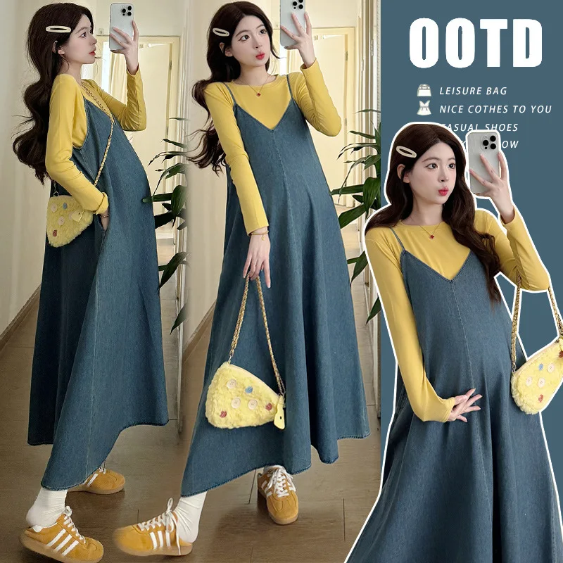 2025 Korean Style Pregnancy Set Autumn Denim Pinafore Long Sleeve Tee Two Piece Outfit Slimming Versatile Maternity Wear  Read more