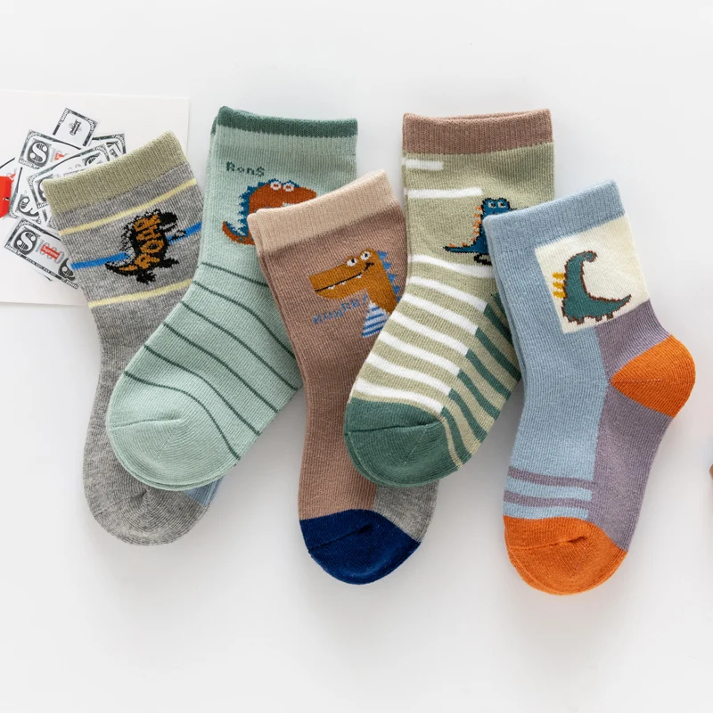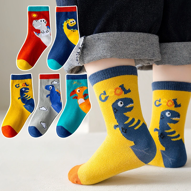 5Pairs Children's Socks Cute Cartoon Dinosaur Theme Baby Boy Mid Tube Cotton Soft Infant Spring Autumn Kids Student Floor Socks