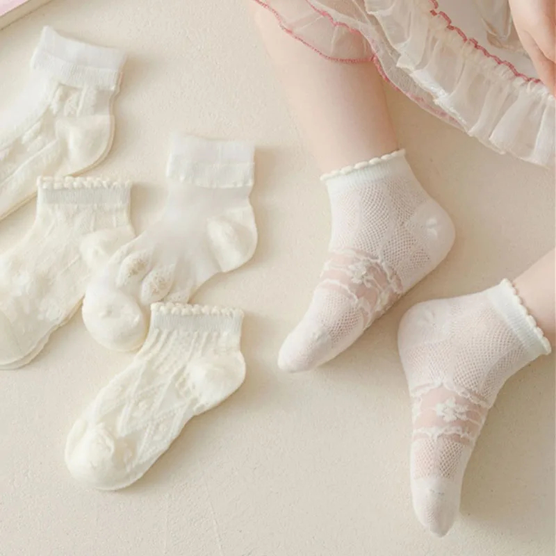 5 Pairs/Lot Girls Socks Summer New Mesh Style Cotton Thin Baby Socks Trendy Elastic White Lace Flowers Children Princess Socks