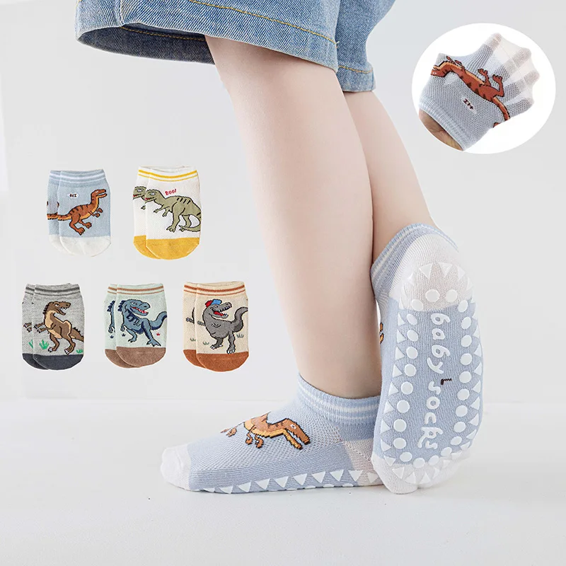 5 pairs of boys' short stockings cartoon dinosaur rubber socks - breathable children's socks, anti-slip children's walking socks
