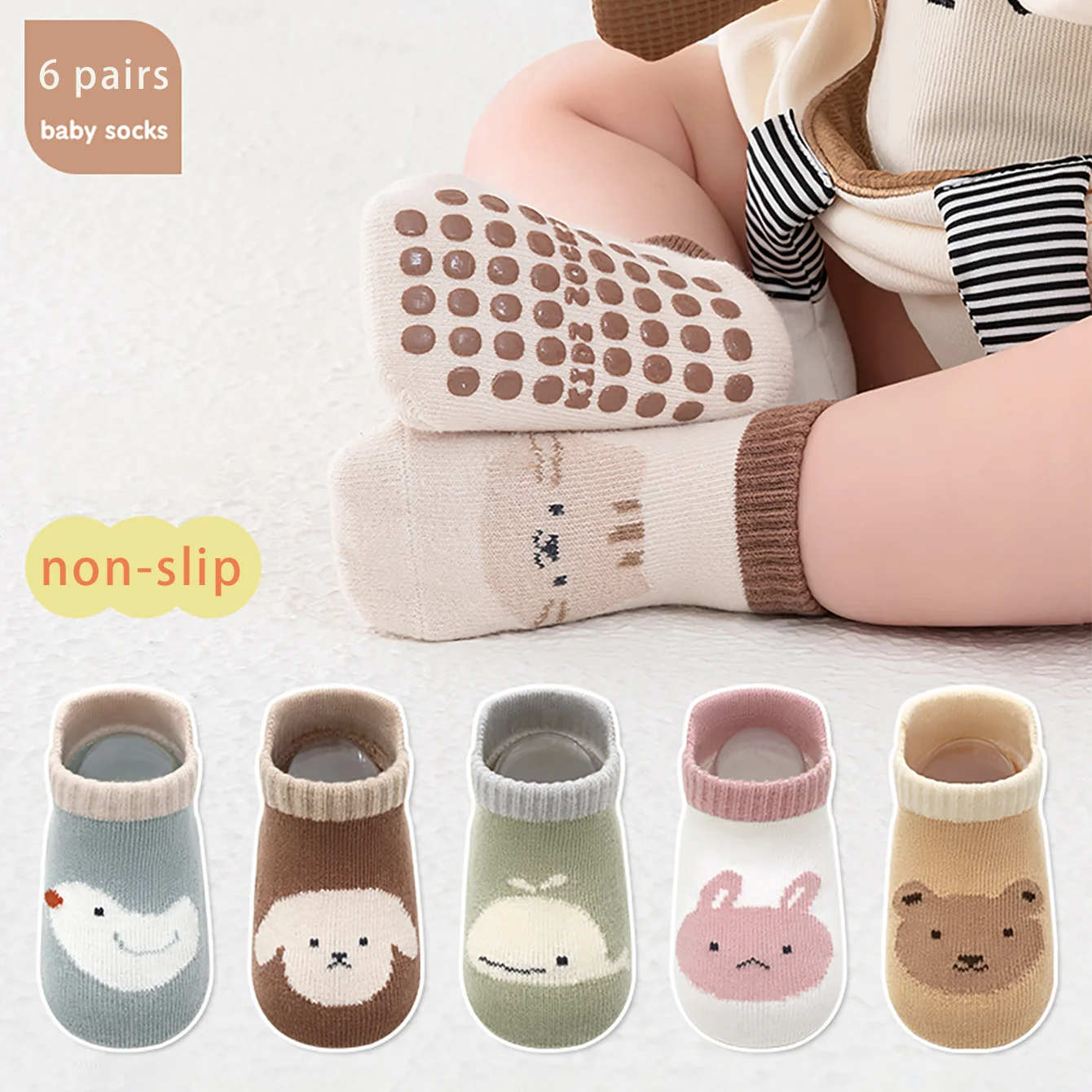 6 pairs of spring and summer new adhesive anti slip baby socks, walking socks, floor socks, animal cartoon avatar baby socks for