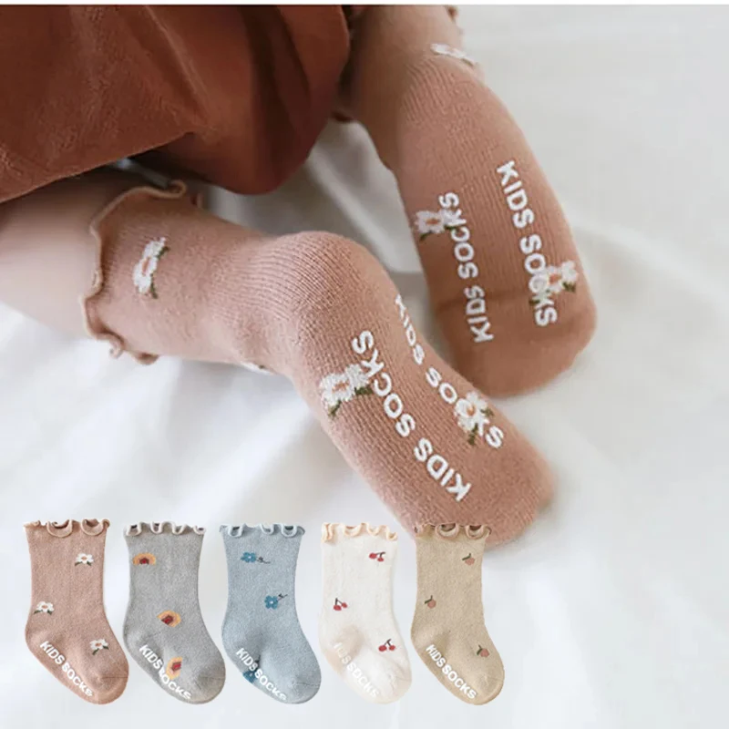 5 Pairs a Lot Autumn Kids Cute Floral Socks Children Girls Flower Cherry Non Slip Socks Baby Floor Walking Socks